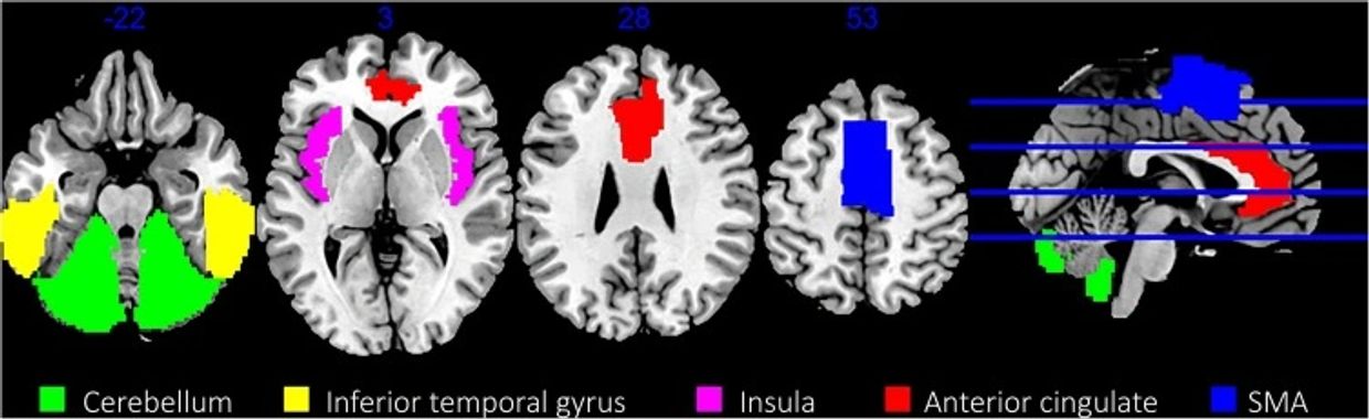 Brain imaging studies related to IGD have shown structural changes in the brain, particularly a reduction in white-matter density (consisting mostly of cells and axons that transmit signals from the cerebellum to other brain regions) and grey-matter volume (associated with emotions, perception, memory, and motor control). Specifically, studies showed several regions of the brain demonstrated reduction in grey-matter volume in gaming disorder participants, as depicted above.